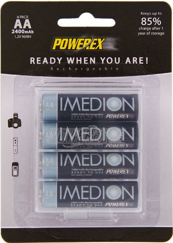 Powerex' new IMEDION line of NiMH rechargeable AA batteries feature a unique extremely low discharge design. Unlike ordinary NiMH rechargeables, which will loose a significant amount of their charge within just weeks, the unique chemistry of Powerex' IMEDION batteries allows them to retain up to 85% of their charge after a whole year of storage. Powerex rechargeble AA batteries are a favorite among professional photographers, with the highest rated "True Capacity" in the marketplace. These new IMEDION batteries are no exception and with their 2400mAh "True Capacity" rating, will outperform comparably rated batteries. With their unique low-discharge design, IMEDION batteries will actually provide longer battery life than regular NiMH rechargeable batteries of a much higher capacity rating in any device that is used intermittently over a period of time. Free storage case included.